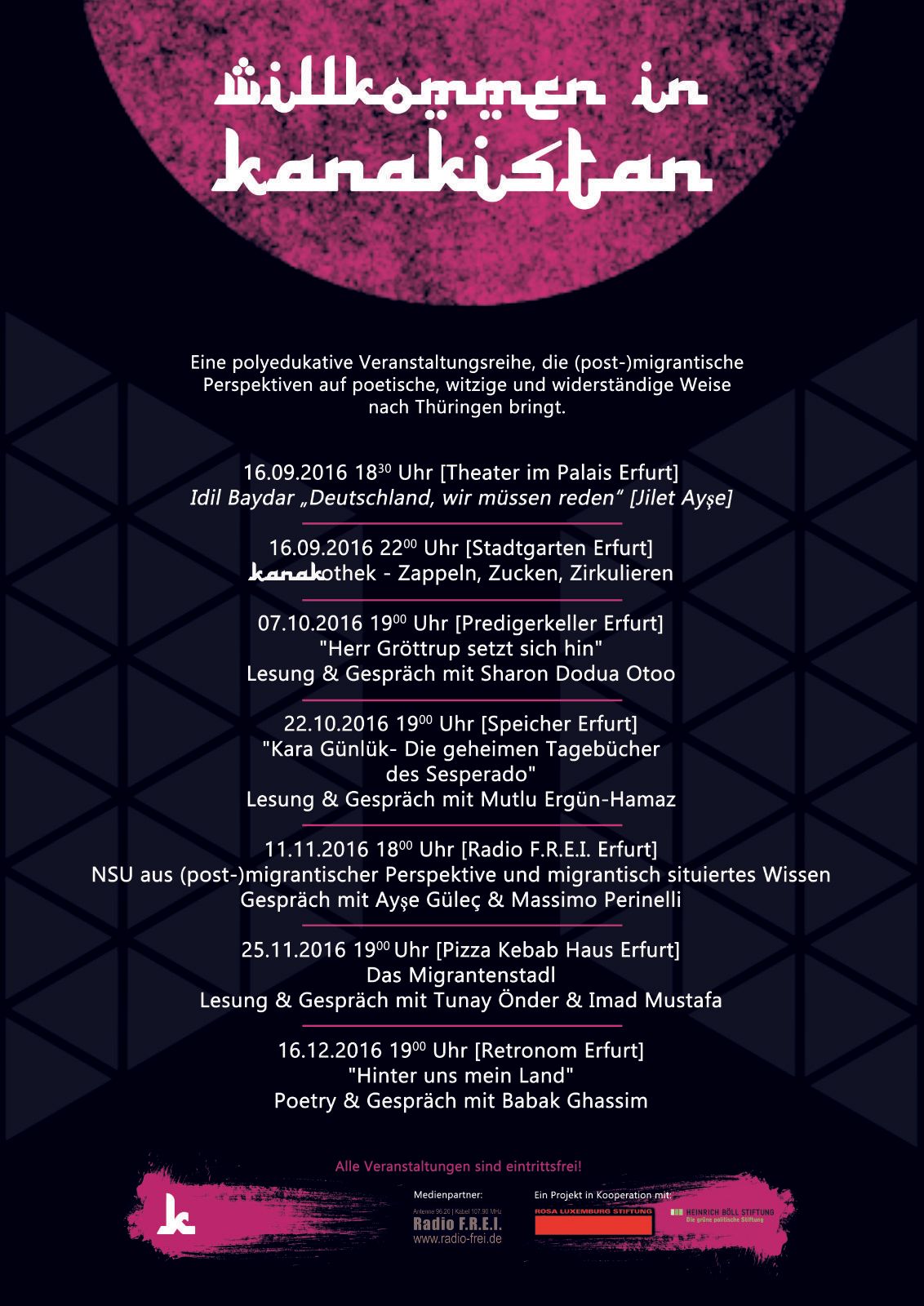 2016 fand die (post-)migrantische Kunst und Kulturreihe "Willkommen in Kanakistan" statt. Viele tolle Gäste kamen nach KANAKISTAN und bereicherten es. Jilet Ayşe, Djane Masta Sai,  Sharon Dodua Otoo, Mutlu Ergün-Hamanz, Ayşe Güleç & Michael Willenbücher, Tunay Önder & Imad Mustafa sowie Babak Ghassim öffneten unsere Herzen und machten KANAKISTAN zu einem noch schöneren Ort.